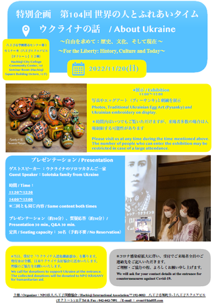 ウクライナ支援チャリティイベントを、11月20日(日)に学園都市センター(八王子スクエアビル(オクトーレ)12階)で開催します。NPO法人八王子国際協会主催。