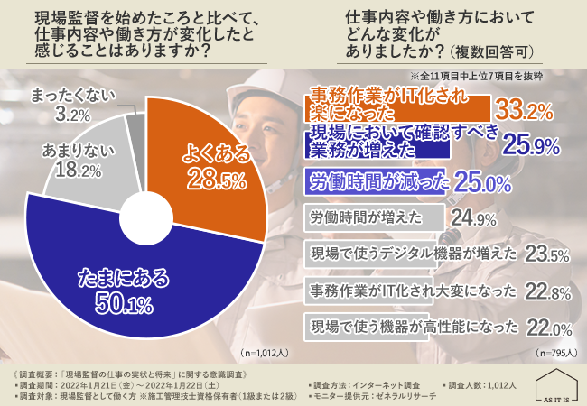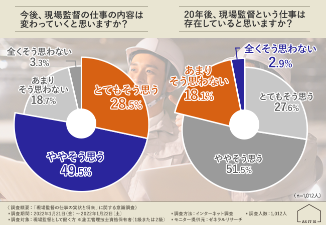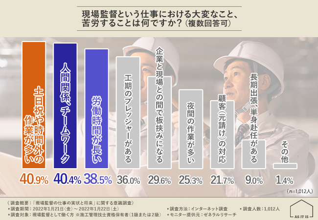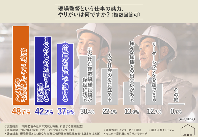 株式会社AS IT IS(代表取締役:弓削 誠)は、現場監督として働く方 ※施工管理技士資格保有者(1級または2級)を対象に、「現場監督の仕事の実状と将来」に関する調査を実施しました。