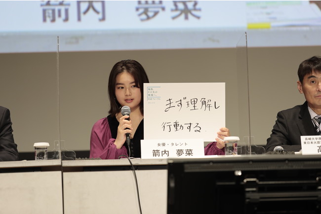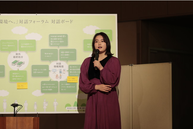 さらに、ゲストである福島県出身の女優・タレントとして活躍する箭内夢菜さんが本フォーラムへの意気込みをコメント。「私たち若者世代に出来ることとして、まずは除去土壌について、復興に向けて必要なことは何なのかを知ることが大切だと感じます。」と除去土壌における課題点・福島県への思いを語りました。