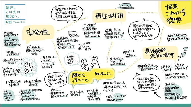 その後、会場参加者に書いていただいた対話ボードの付箋や、ライブチャットで投稿いただいた御質問・御意見についても登壇者から回答しました。 参加者からは「学校教育の必要性」について意見が寄せられ、箭内さんは「学校行事の一環で実施を検討出来るのでは」といった意見を発表した後、環境省・室石局長は「修学旅行先に福島を選んでいただけるようにするといった形もある」とコメント、笠井さんは学生として、「社会貢献の面を押し出せていけば興味を持つ学生が増える可能性があると考える」と意見を述べました。