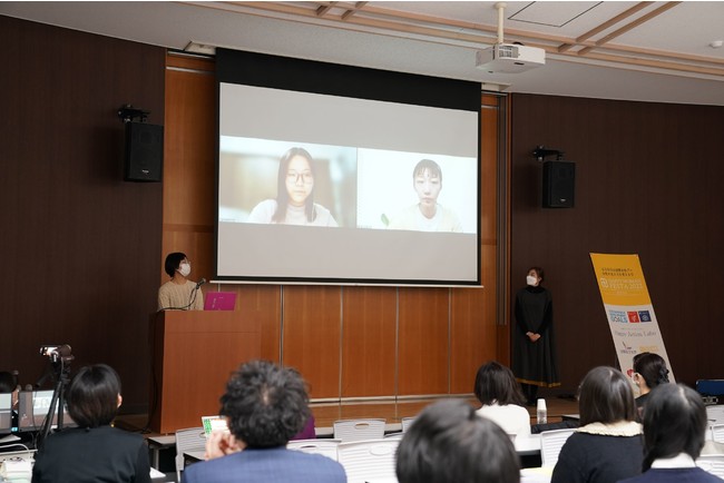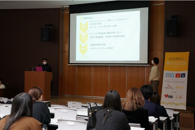 第一部では「Happy Action Labo」の学生が、これまでのワークショップの成果を発表。10名の学生が「チーム ほうじ茶」「チーム ふぶき」「チーム 甘党」の全3チームに分かれ、「ジェンダー平等を実現するためのアイデア」をテーマに、2030年の目標とそれを実現するためのアイデアをプレゼンテーションしました。