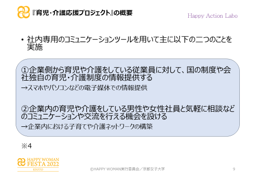 各企業内でグループチャットやファイル共有サービスを活用して「企業側から育児や介護をしている従業員に対して、国の制度や会社独自の育児・介護制度の情報提供する」「企業内の育児や介護をしている男性や女性社員と気軽に相談などのコミュニケーションや交流を行える機会を設ける」ことをアイデアとして発表。 これにより仕事と家庭の両立をしやすい職場環境構築の支援ができるのではないかと考えました。