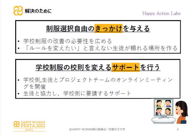 女子学生のスラックス制服採用率のデータや、女子高校生の中にも「スラックスを着用したい」「どちらも利 用したい」という意見があるデータを集め、「制服のジェンダー平等を目指す会」の発足をアイデアとして発表。