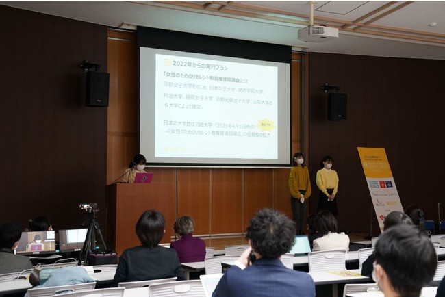 学生たちは、「京都女子大学で現在行われているリカレント教育を活用し、ライフステージの変化などで退 職、休職した女性たちが就職・復職できるサポートを行いたい。」「より多くの方々に「女性のためのリカレン ト教育」があることを知ってもらい、活用してもらいたい。」とプレゼンテーション。