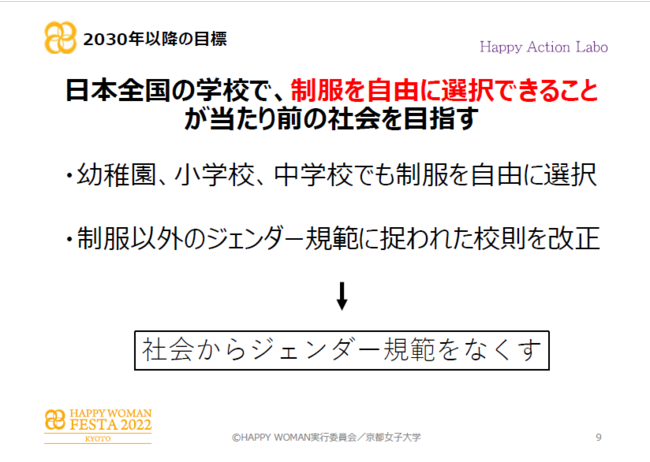 2030 年の目標を「自由に制服を選択することのできる高校を 9 割以上にする」ことに設定。
