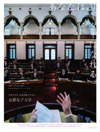 現代の日本の社会は、海外の主要国と比べて、政治やビジネスなど主要な意思決定領域における女性参画が大きく遅れているのが現状です。その要因は様々ですが、家庭内での負担の大さきや男性優位の職場環境から、女性自身が重要なポジションにつくことを躊躇ってしまう場面も多く見られます。そんな女性たちの背中を押すために、「あなたは、リーダーになれる」というシンプルで強いキャッチフレーズにしました。古い考え方に捉われず、自分の力を信じて社会で活躍できる女性の育成を目指す、本学の想いを込めています。撮影は重要文化財でもある京都府庁旧本館の旧議場で実施。議会で登壇し、リーダーとして発言する女性の目線をイメージしたビジュアルとなっています。