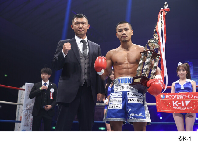 本戦第15試合のスーパーファイト/K-1スーパー・フェザー級勝利者の江川優生選手へトロフィーを贈呈させていただきました。