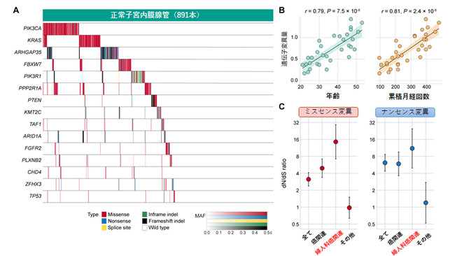 1.正常内膜腺管891本のゲノム解析を行った結果、半数以上の腺管が何らかの癌関連遺伝子変異を有しており、中でも、既報でも報告されていたPIK3CAやKRAS変異*3を有する腺管がそれぞれ15.6%, 10.9%の頻度で見つかりました(図1A)。腺管が有する遺伝子変異の量は、年齢や累積の月経回数に伴って増えることがわかりました(図1B)。また、遺伝子変異の種類に着目して解析を行ったところ、婦人科癌に関連する遺伝子変異に特に強い自然選択圧がかかっており、その遺伝子変異が腺管の生存に有利に働いている可能性があることがわかりました(図1C)。