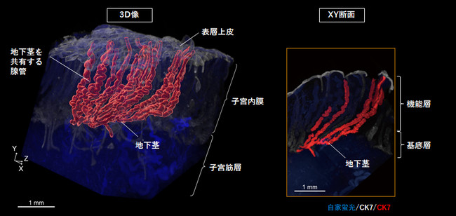 3.しかしながら、子宮内膜は月経のたびに剥がれ落ちる組織であり、どうやって腺管はそのクラスターの領域を拡大していくのでしょうか。その謎を解明するために、本研究グループは子宮内膜腺管の3次元構造に着目しました。本研究グループは、先行研究で子宮内膜の3次元撮影に成功し、月経の際に剥がれ落ちずに残る基底層の腺管に網目のような地下茎構造があることを突き止めています(図3)。