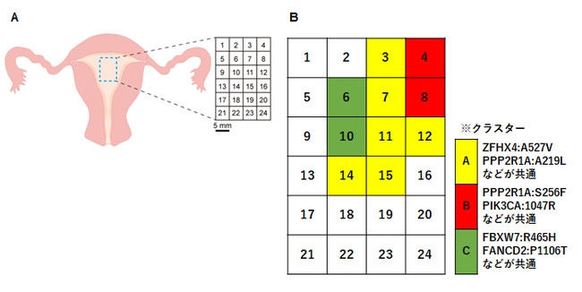 2.それでは、生存に有利な変異を獲得した腺管は、子宮内膜の中でどのように分布しているのでしょうか。それを確認するため、摘出した子宮の内膜を区域分けし、区域ごとに腺管を分離して腺管の位置情報を加味したゲノム解析を行いました(図2A)。その結果、同じ起源の遺伝子変異を持つ複数の腺管が、隣接する区域にまたがって分布し、クラスターを形成していることがわかりました(図2B)。