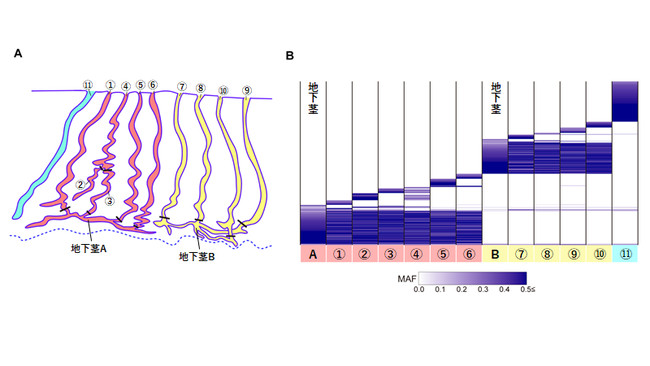 B. 全ゲノム解析結果。縦軸は個々の腺管を示し、横軸は遺伝子変異を示しています。地下茎Aと腺管1.~6.は多くの遺伝子変異が共通していることがわかります。同様に、地下茎Bと腺管7.~10.も多くの共通する遺伝子変異を持っています。MAF値は多くの変異で高い値を示しており、地下茎と、地下茎から連続する腺管は同じ遺伝子変異プロファイルを有するモノクローナルな集団であることがわかります。一方、地下茎A・Bどちらにも連続しない腺管11.は、遺伝子変異プロファイルも独立しています。