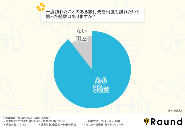 そこで、「一度訪れたことのある旅行先を何度も訪れたいと思った経験はありますか?」と質問したところ、8割以上の方が『ある(89.6%)』と回答しました。