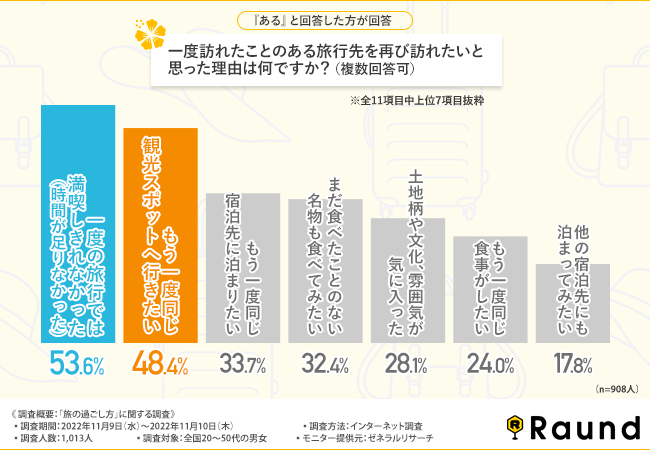 『ある』と回答した方に、「一度訪れたことのある旅行先を再び訪れたいと思った理由は何ですか?(複数回答可)」と質問したところ、『一度の旅行では満喫しきれなかった(時間が足りなかった)(53.6%)』と回答した方が最も多く、次いで『もう一度同じ観光スポットへ行きたい(48.4%)』『もう一度同じ宿泊先に泊まりたい(33.7%)』と続きました。