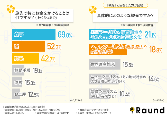 そこで、「旅先で特にお金をかけることは何ですか?(上位3つまで)」と質問したところ、『食事(69.0%)』と回答した方が最も多く、次いで『宿(52.3%)』『観光(42.7%)』と続きました。