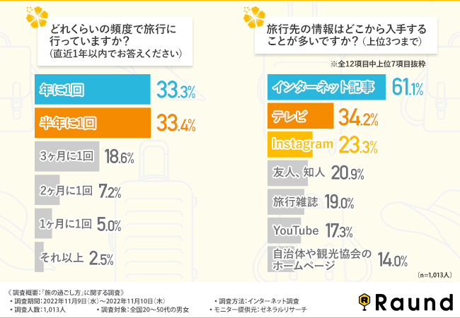 旅行に行っている頻度や、旅行先に関する情報収集の方法などが分かりました。