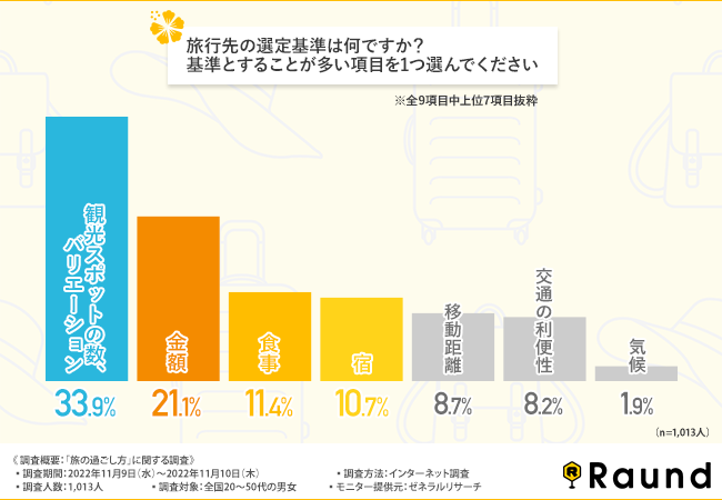 「旅行先の選定基準は何ですか?基準とすることが多い項目を1つ選んでください」と質問したところ、『観光スポットの数、バリエーション(33.9%)』と回答した方が最も多く、次いで『金額(21.1%)』『食事(11.4%)』『宿(10.7%)』と続きました。