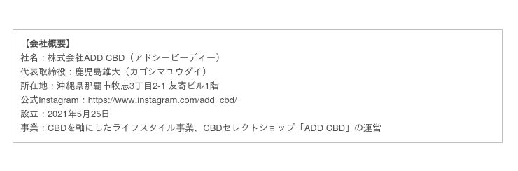 株式会社ADD CBD(本社:沖縄県那覇市、代表取締役:鹿児島雄大)が展開する「ADD CBD(アドシービーディー)」は、株式会社qols(本社:徳島県徳島市、代表取締役:堀金建吾)が運営するメイドインジャパンのCBDブランド「CBDAYS MOMENT(シービーデイズモーメント)」のセカンドブランドとして昨年6月に沖縄・国際通りに誕生。より多くの方にCBDの素晴らしさを知っていただき、CBDを取り入れたライフスタイルを提案するセレクトショップを運営しています。