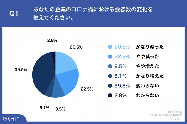 「Q1.あなたの企業のコロナ禍における会議数の変化を教えてください。」(n=316)と質問したところ、「かなり減った」が20.5%、「やや減った」が22.5%という回答となりました。