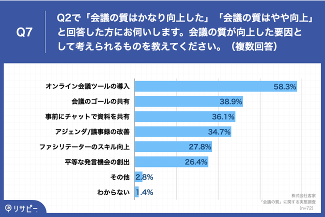 Q2で「会議の質はかなり向上した」「会議の質はやや向上」と回答した方に「Q7.会議の質が向上した要因として考えられるものを教えてください。(複数回答)」(n=72)と質問したところ、「オンライン会議ツールの導入」が58.3%、「会議のゴールの共有」が38.9%、「事前にチャットで資料を共有」が36.1%という回答となりました。
