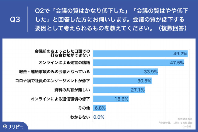 Q2で「会議の質はかなり低下した」「会議の質はやや低下した」と回答した方に「Q3.会議の質が低下する要因として考えられるものを教えてください。(複数回答)」(n=59)と質問したところ、「会議前のちょっとした口頭での打ち合わせができない」が49.2%、「オンラインによる発言の躊躇」が47.5%、「報告・連絡事項のみの会議となっている」が33.9%という回答となりました。
