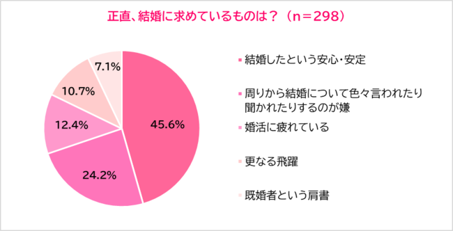 最後に「正直なところ、結婚に求めているものは何か」尋ねました。「結婚したという安心・安定」(45.6%)が最多な一方、「周りから結婚についていろいろ言われたり聞かれたりするのが嫌」(24.2%)や「婚活に疲れている」(12.4%)という理由で、婚活女子の3人に1人が結婚を急いでいることもわかりました。また、結婚がゴールではなくスタート地点と考え、「更なる飛躍」(10.7%)と回答する人も1割超いました。