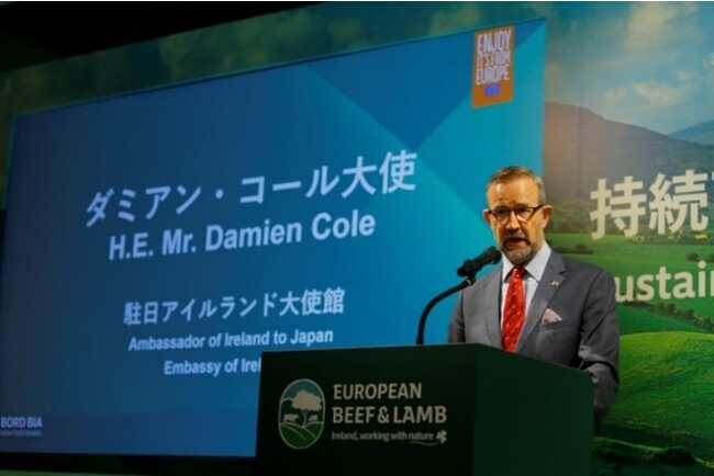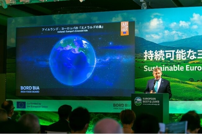この発表会の翌日には、東京で65名バイヤーやメディア関係者を招いて業界向けトレードセミナーを開催、このセミナーでは、チャーリー・マッコナローグ農業・食糧・海洋大臣、ダミアン・コール駐日アイルランド大使が出席し、アイルランド産の、ヨーロピアン ビーフ&ラム のサステナブルな生産方法についてのプレゼンテーションを行いました。