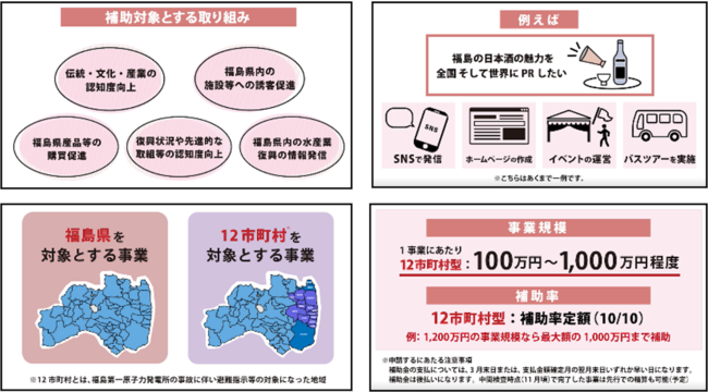 経済産業省から補助金の交付を受けた株式会社ジェイアール東日本企画(事務局)が、東京電力福島第一原子力発電所の事故に伴い避難指示等の対象となった12市町村(田村市、南相馬市、川俣町、広野町、楢葉町、富岡町、川内村、大熊町、双葉町、浪江町、葛尾村、飯舘村)を中心とした福島県の風評被害の払拭や交流人口の増加に向け、 地域の伝統・魅力等の発信や、交流人口増加のための取組を行う民間団体等(間接補助事業者)を支援するものです。