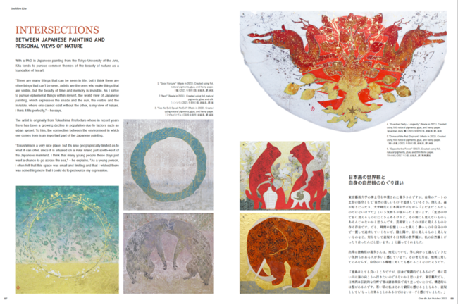 今回は日本画家 斉藤和の作品 「雪の移ろう」「月の袂に」が表紙を彩る。癒しと冬の透き通った香りを感じさせる今号の表紙は斉藤和の作風ならでは。特集ページでは斉藤和が日本画に吹き込むいのちについて語られている。