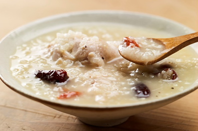 九州鵜育ちの華味鶏のほか毛人参(高麗人参の根の部分)やナツメ、クコの実などが入り身体を温めチャージする滋養食です。鶏がらだしも6時間かけてじっくり煮出しています。お子様にも人気があります。