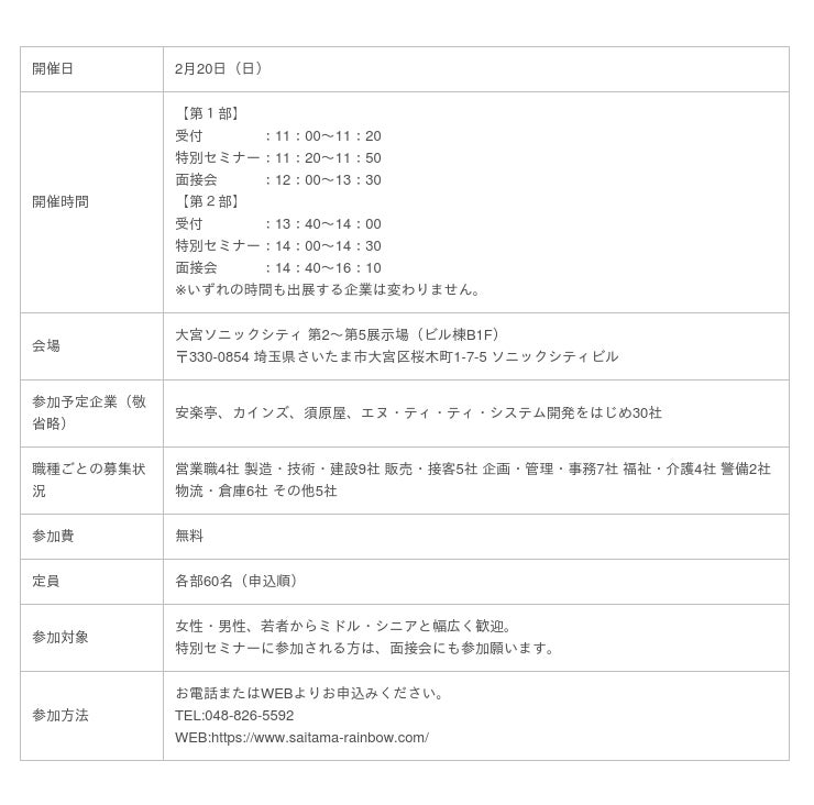 【埼玉県が勤務地の30社が参加!】働き方・経営改革を進める埼玉県内企業の人事担当者と会えるイベント。女性・男性、若者からミドル・シニアまで様々な人をつなぐ虹の架け橋となる「レインボー面接会」を2月20日(日)大宮ソニックシティで開催します。企業名や事業内容、募集職種等の詳細はHPをご確認ください!