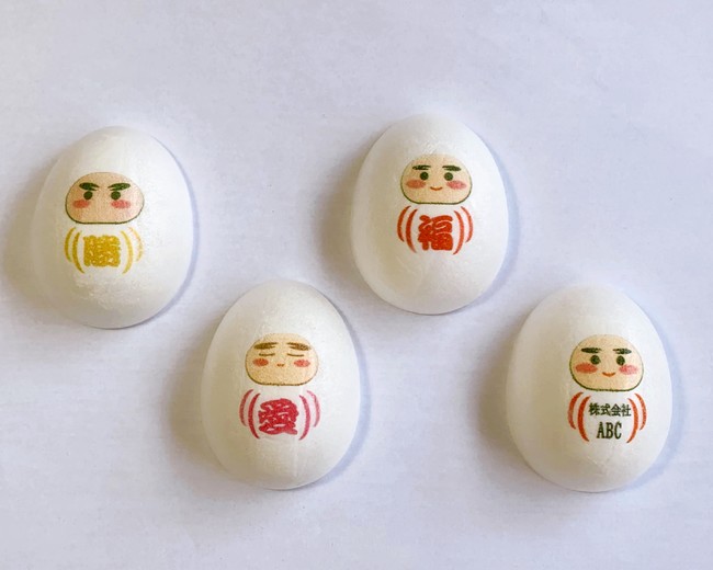 可愛らしいダルマの絵が、食紅でプリントされています。絵柄の種類は現在3種類有り、ダルマの腹部には「福」「愛」「笑」を印字。色とりどりで見た目でも楽しめます。