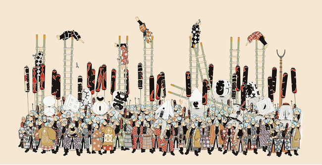 岡田氏は幼少期の頃より実際に地域で祭に参加し、自分の目で見てきた祭に関わる「粋」な人々を描き続けてきました。一方の木下氏は、祭の氏子地域の街の風景の今昔を、事実に基づいて重ね絵図で表現してきました。両氏の作品から、感染症拡大によって一時的に姿を消した祭の熱気や街の活気に思いを馳せ、来たるべき祭の復活の日を祈ります。