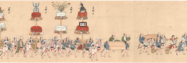 江戸時代中期の山王祭における祭礼行列の様子を描いたもので、作者は不詳。華やかな装束に身を包んだ行列と山車・附祭(つけま つり)の様子は、江戸時代に行われた山王祭の様子を知る貴重な歴史資料であると同時に、祭に浮き立つ江戸の町民たちの姿が伺える、楽しい絵巻物です。第一巻は16.5m、第二巻は13.6m、第三巻14.91mの総長約45mから成る絵巻のうち、本展では第一巻を忠実に再現したレプリカを展示します。
