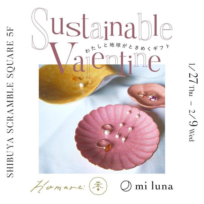 「Sustainable Valentine -わたしと地球がときめくギフト- 」というテーマのサスティナブルなブランドの合同POPUPです。今回のPOPUPでは、地球に優しいサスティナブルジュエリー「mi luna」と「HOMARe:」の2社が参加します。