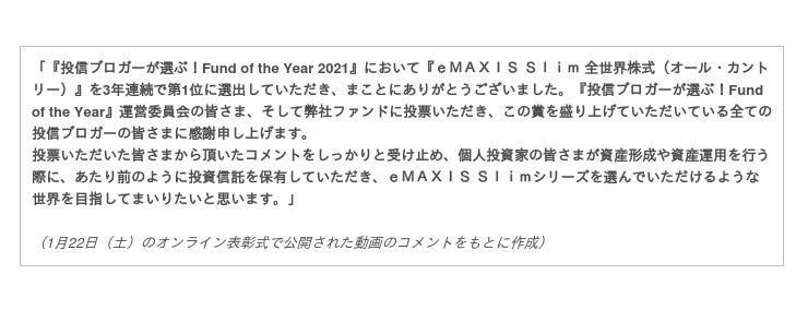 常務取締役の代田秀雄(しろた・ひでお)は『eMAXIS Slim 全世界株式(オール・カントリー)』の受賞に際し、以下のようにコメントしています。