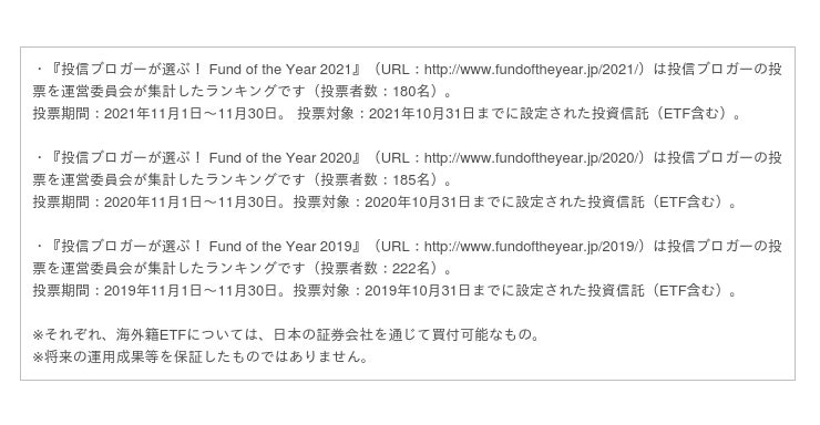 ※『投信ブロガーが選ぶ! Fund of the Year 2020』および『投信ブロガーが選ぶ! Fund of the Year 2019』にて第1位を受賞。