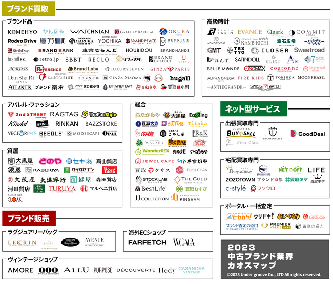 ブランド買取FirstClass-ファーストクラス-を運営する、株式会社アンダーグルーヴ(東京都新宿区、代表取締役:小林嶺、以下「弊社」)は「中古ブランド品リセール業界」に関するカオスマップを作成しました。(掲載店舗数155社)