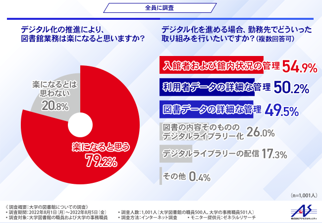 株式会社アクセスセキュリティ(本社所在地:東京都中央区、代表取締役:古田 貴行)は、大学図書館の職員および大学の事務職員を対象に、大学の図書館についての調査を実施しました。