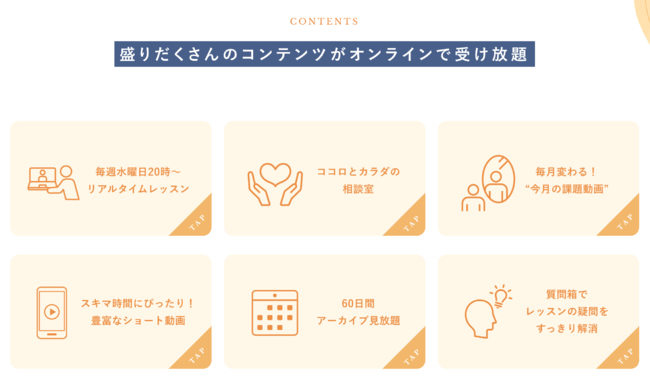 また、レッスンの疑問を解決できる「質問箱」の設置や、身体のお悩みやレッスンの受講プランをトレーナーに直接相談できる「ココロとカラダの相談室」を開催など、オンラインでも疑問をそのままにせずモチベーションを維持し続けられるコンテンツをご用意しております。