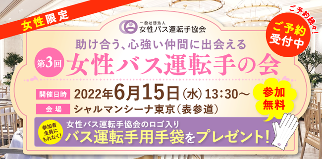 一般社団法人女性バス運転手協会は、2022年6月15日(水)に、シャルマンシーナ東京 B1階 ノヴェルクリスタル(表参道)で、『第3回 女性バス運転手の会』を開催します。現役バス運転手の女性、バス運転手を目指す女性が参加でき、参加費は無料です。