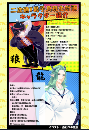 番組記者である野口衣織の「理想の二次元男子を具現化したい」という公私混同の野望を叶えるため、スタッフと番組編集長である吉田アナが奔走。キャラクターデザインは、野口記者の熱望により人気マンガ家、白石ユキ先生に依頼。忙しいスケジュールの合間で、野口記者の妄想をあますことなく詰め込んだ、渾身のイケもふ狼の「紫狼(シロウ)」とイケ青龍「セイ」が爆誕しました。理想のキャラクターの誕生に野口記者も大歓喜!