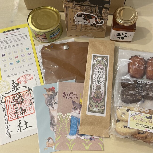 猫モチーフのお菓子や雑貨等に加え妻恋神社の限定御朱印も入って、ねこまつりを満喫できるセットになっております。