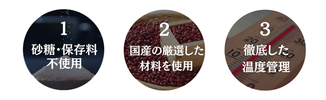 2. 小豆は北海道十勝産の特別に栽培されたものを使用。糀(こうじ)は糖化に特化した 特別なものを厳選し世界唯一の糀[福ノ素 1 号]を使用。糀の発酵を促進させるために、 塩はミネラル・マグネシウムが豊富な沖縄県産の特別天然塩を使用しております。