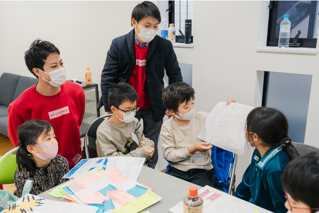 アットオフィスは、オフィス移転のコンサルティングを通して、中小企業やベンチャー企業を支援しています。『HELLO! "ヘンテコ" FuTuRe’s Town 2022』プロジェクトに参加する小学生たちは、自由な発想で新しい仕事を生み出す、未来の起業家。つまり、プロジェクトへの協賛は、超シード期の小さなベンチャー社長たちへの投資です。また、あえてオフィスらしくない秘密基地のような戸建てオフィスを紹介することにより、働く場所づくりも自由だというメッセージになればと、「at Labo」で会場協力。今回は会場だけでなく、有志社員5名がメンターとして参加し、小学生たちの理想の街づくりのサポートをしました。