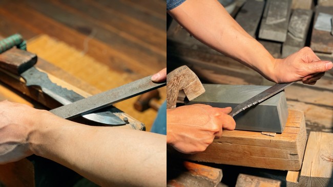 本来、刀匠による刃物の製作は非常に時間とコストがかかりますが、先行して形状だけを製作し、刀匠が焼き戻しや刃付け・仕上げを行うプロセスで製作することにより、時間とコストを抑えています。