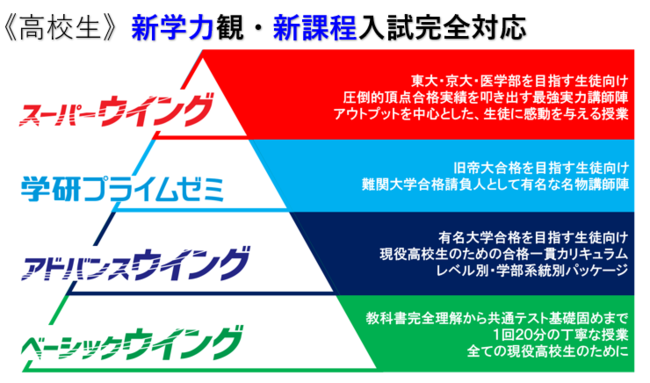 従来のウイングネットコンテンツ「ベーシックウイング」(教科書対応定期テスト対策・共通テスト対策・基礎力定着)、「アドバンスウイング」(国公立・有名私大対策)、「学研プライムゼミ」(難関国公立・私大対策)」の3つのコンテンツに加え、新たに東大・京大・医学部など最難関大学を目指す生徒を対象に、学びを広げる「スーパーウイング※1」を新たに作成。