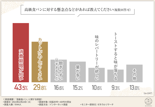 そこで、「高級食パンに対する懸念点などがあれば教えてください(複数回答可)」と質問したところ、『消費期限が短い(43.5%)』と回答した方が最も多く、次いで『カットがめんどくさい(29.8%)』と続きました。