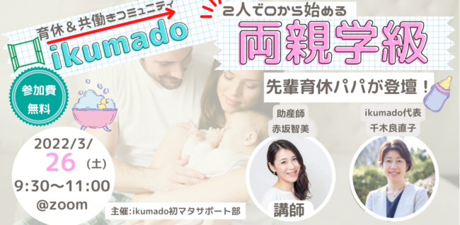 育休&共働きコミュニティikumado(イクマド)を運営する株式会社COEOは、コロナ禍で不安の多い初めての出産を迎える妊婦さんとパートナーの方向けに、「2人で0から始める両親学級」イベントを2022年3月26日(土)にオンラインにて開催します。