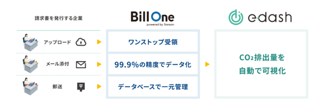 Bill Oneは、あらゆる請求書をオンラインで一括受領・データ化するクラウド請求書サービスです。今回の連携では、Bill Oneが受領したエネルギー関連の請求書データをe-dashへ自動的に連携し、当該データに基づくCO2排出量をe-dashが算出します。これまでe-dashを利用する企業の担当者は、e-dashへ請求書をアップロードする必要がありましたが、本連携により、請求書の受け取りからCO2排出量の算出・可視化までをクラウド上でシームレスに行うことが可能になり、集計業務を担う担当者のさらなる業務効率化を実現できます。