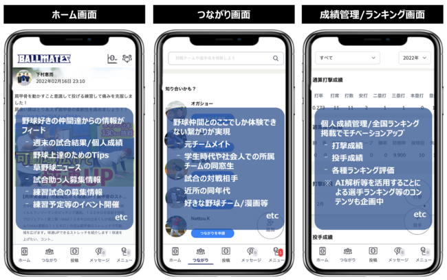 Ballmatesを使えば懐かしのメンバーや対戦相手たち、近場の野球選手、年齢の近い選手等と繋がることができ、試合結果や野球に関するトピックの情報共有が可能になります。
